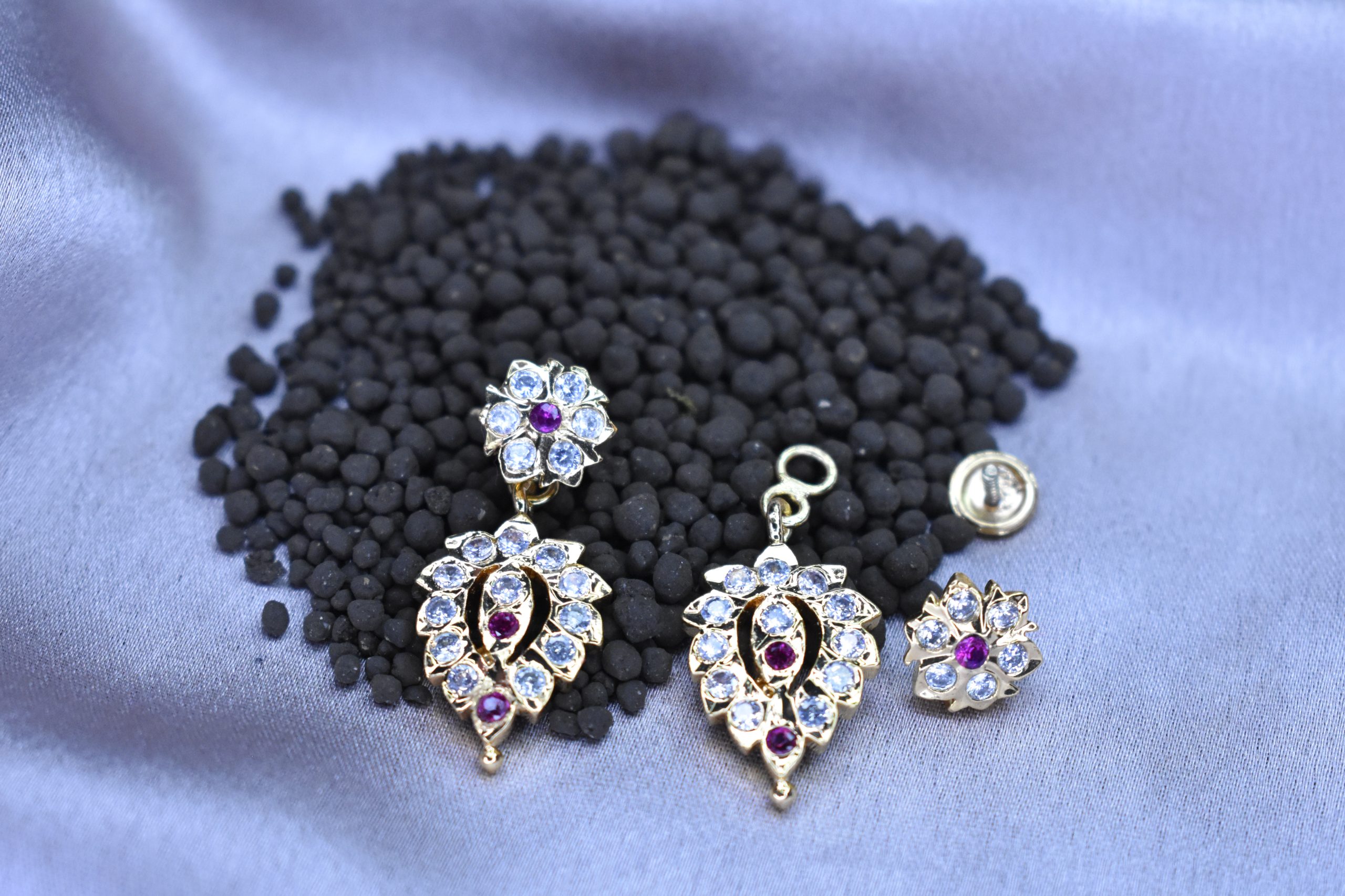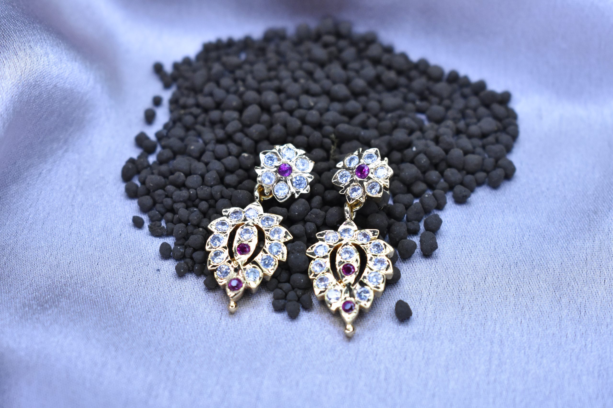 Elevate your elegance with these exquisite gold and white AD studded earrings, designed in a stunning leaf-designed motif. Each earring features a delicate stone hanging that captures light beautifully, creating a dazzling effect. Crafted with precision, these earrings are perfect for both formal occasions and everyday wear, adding a touch of sophistication to any ensemble. Indulge in the luxury of these timeless accessories that embody grace and style.