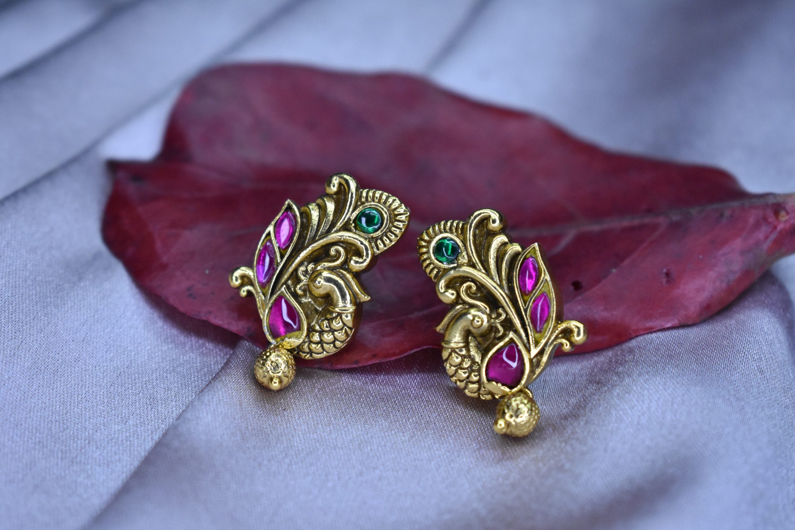 Elevate your festive attire with these exquisite stud earrings, featuring a stunning combination of peacock and gold beads, adorned with sparkling stones. The intricate design is enhanced by delicate rose pink stones and vibrant green accents, making these earrings a perfect accessory for any celebration. Their unique color palette and elegant craftsmanship ensure they will be a standout addition to your jewelry collection.